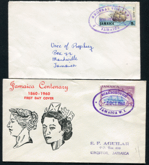 JAMAICA: (17380) UNCLAIMED/village TRD cancels/card/cover