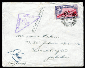 GIBRALTAR: (19151) KG6 FPO 475 cover with CENSOR postmark/cancel