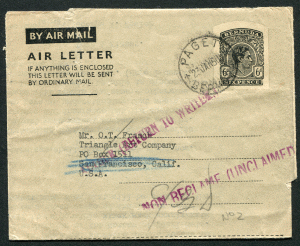 BERMUDA (21335) shells/PAGET cancel/KG6 6d Air Letter/unclaimed