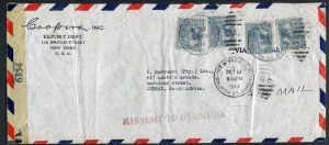 BERMUDA (21336) Church Str Annex, N.Y. to South Africa/cancel/missent censor cover