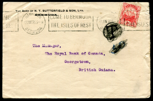 BERMUDA: (19193) 1927 to British Guiana tax cancel/KGV cover