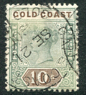 GOLD COAST: (21446) CAPE COAST cancel on QV 10/-, Cat.£70