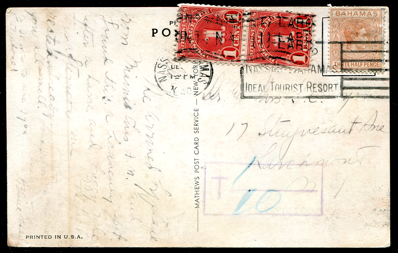 BAHAMAS: (20747) 1940 taxed postage due Hotel ppc to New York