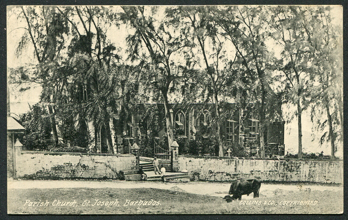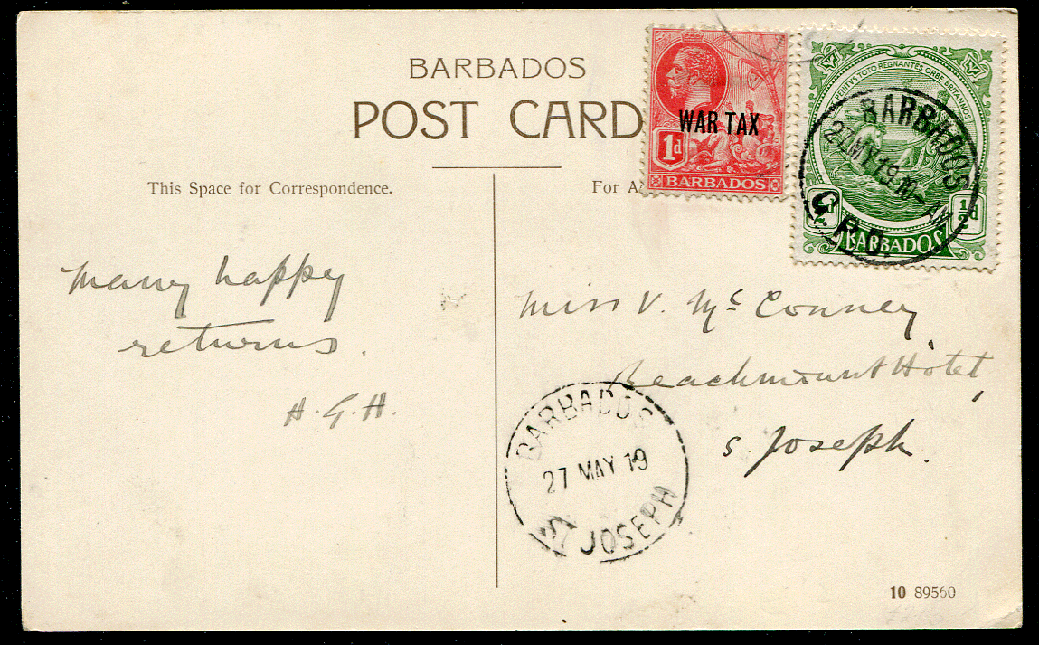 BARBADOS (25352): 1919 War Tax/St. Joseph Church ppc/cancel