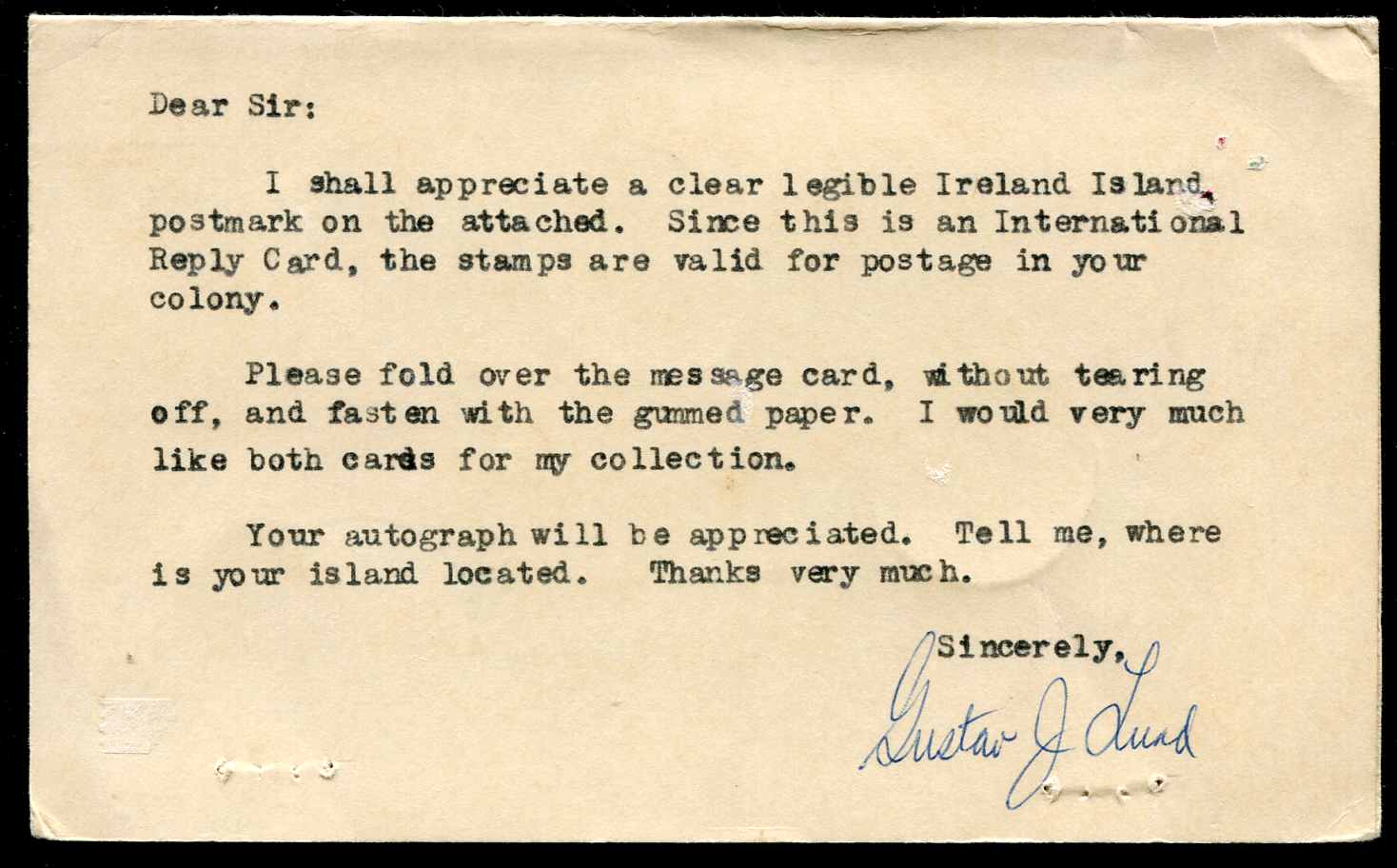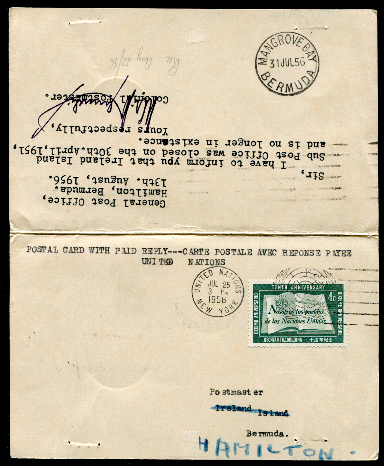 International Reply Card requesting Ireland Island pmk (sub office closed) but got Mangrove Bay and Hamilton