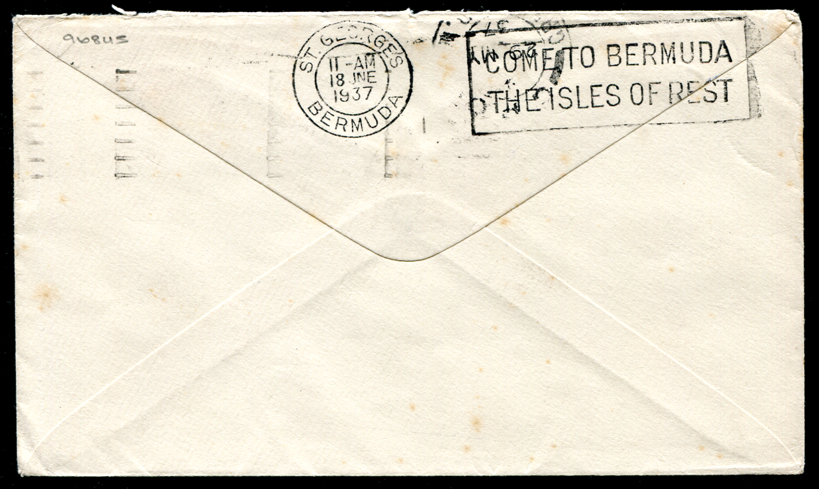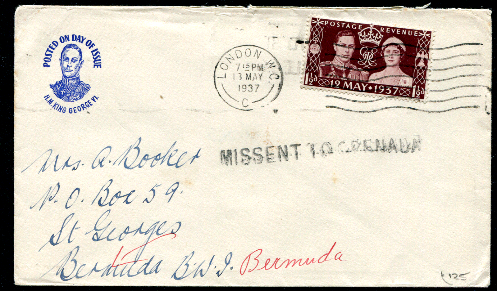 full cover pmk’d London 13 MAY 1937, MISSENT TO GRENADA handstamp, backstamped St. Georges Bermuda 18 JNE 1937 machine slogan