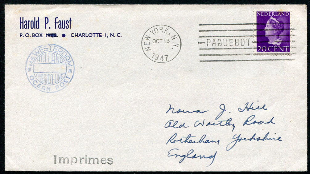 NETHERLANDS (24905): 1947 ms Westerdam/paquebot cancel/cover