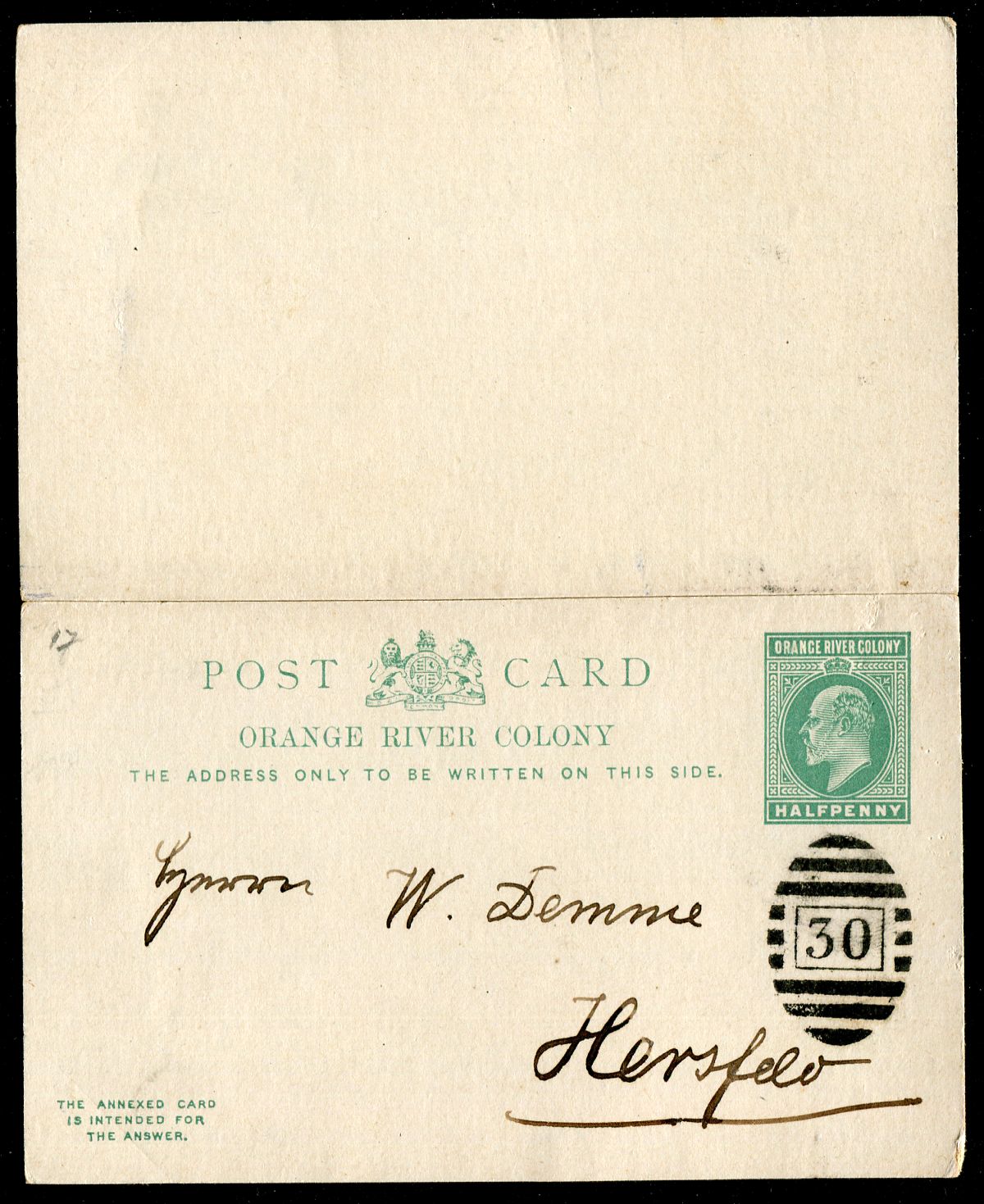 ORANGE RIVER COLONY (21231) numeral “30” cancel/cover/Reply Card