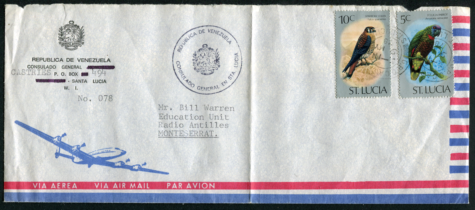 ST. LUCIA (21916) Birds/Consulate Venezuela to Montserrat/cancel/cover